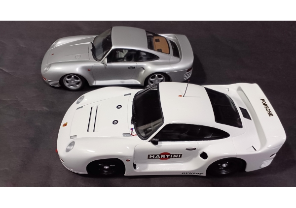 :1987年の西ドイツ車。959は4WD試作車、961はルマン24時間レースに参加し7位入賞を果たした車。日本の模型メーカー「タミヤ」の作品。959は設計図に従い作成、961は同...
