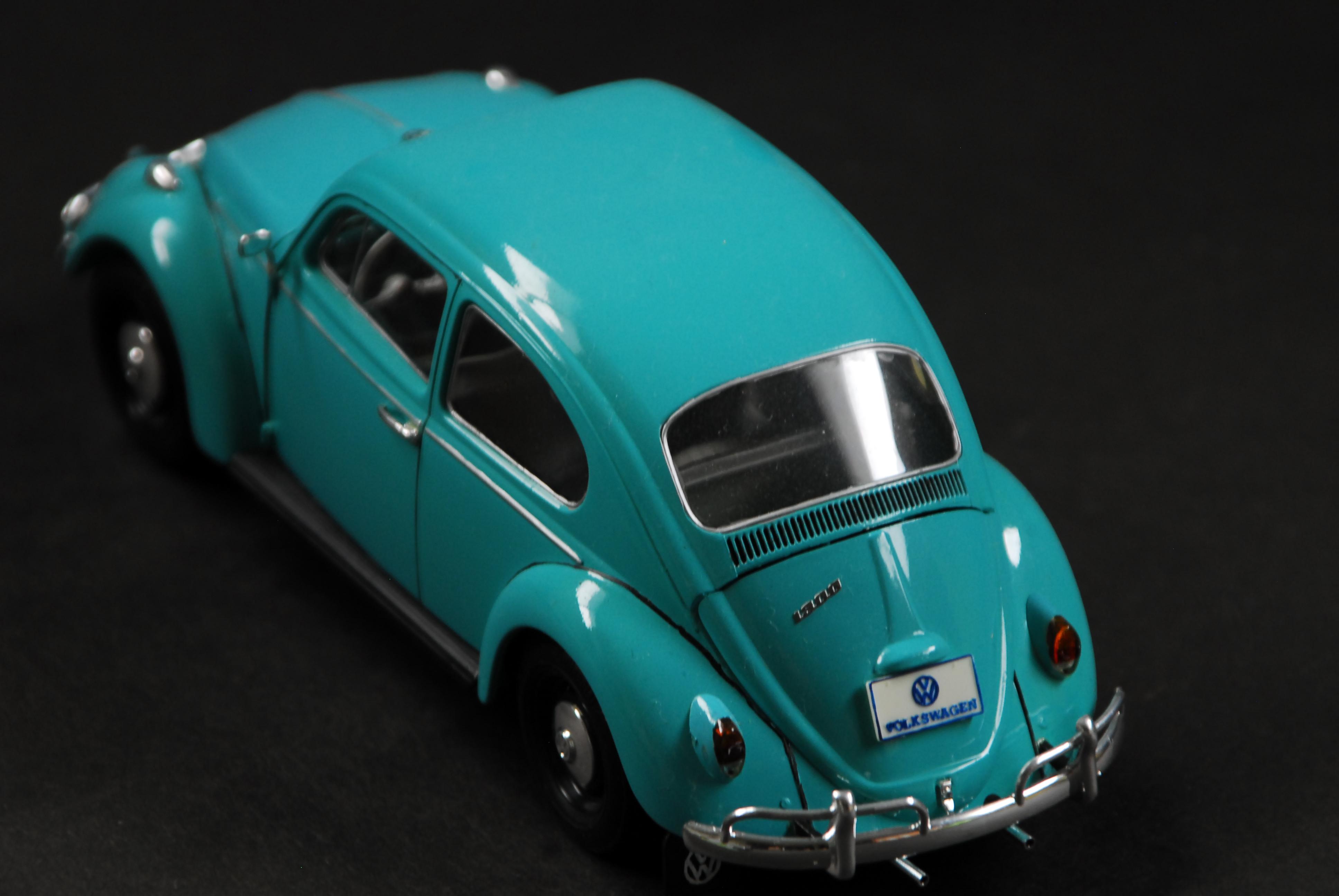 この模型もん十年前に作成したお気に入りの1台でした。最近また購入しあらたに作成しようと以前に作成した際の注意点を思い出したりしていました。確か設計図に「バハマブルー」の提案がありこの色が明るくビートルの形に似合う色の一つと思います。