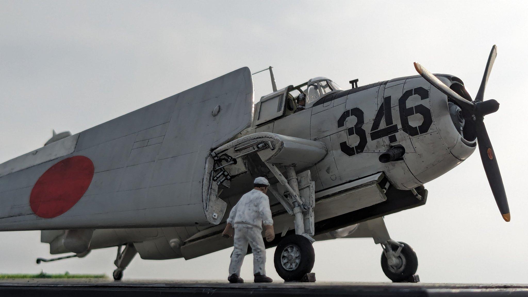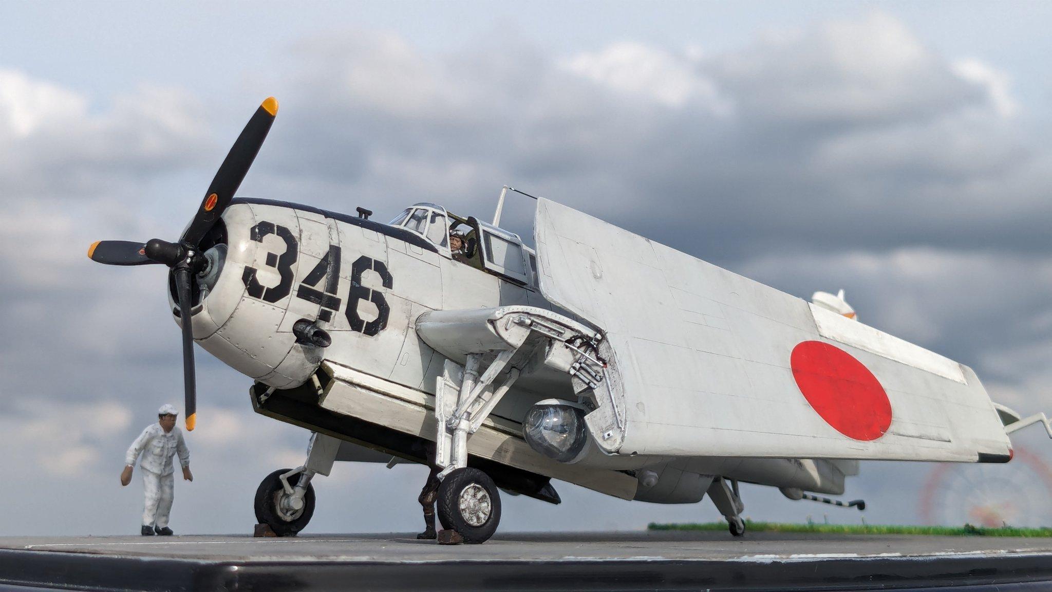 爆弾倉とグラマン特有のストウィング折り畳み機構の改造と、150kg対潜爆弾を3Dプリンターで作成、搭載して発進準備している情景をジオラマにしました。