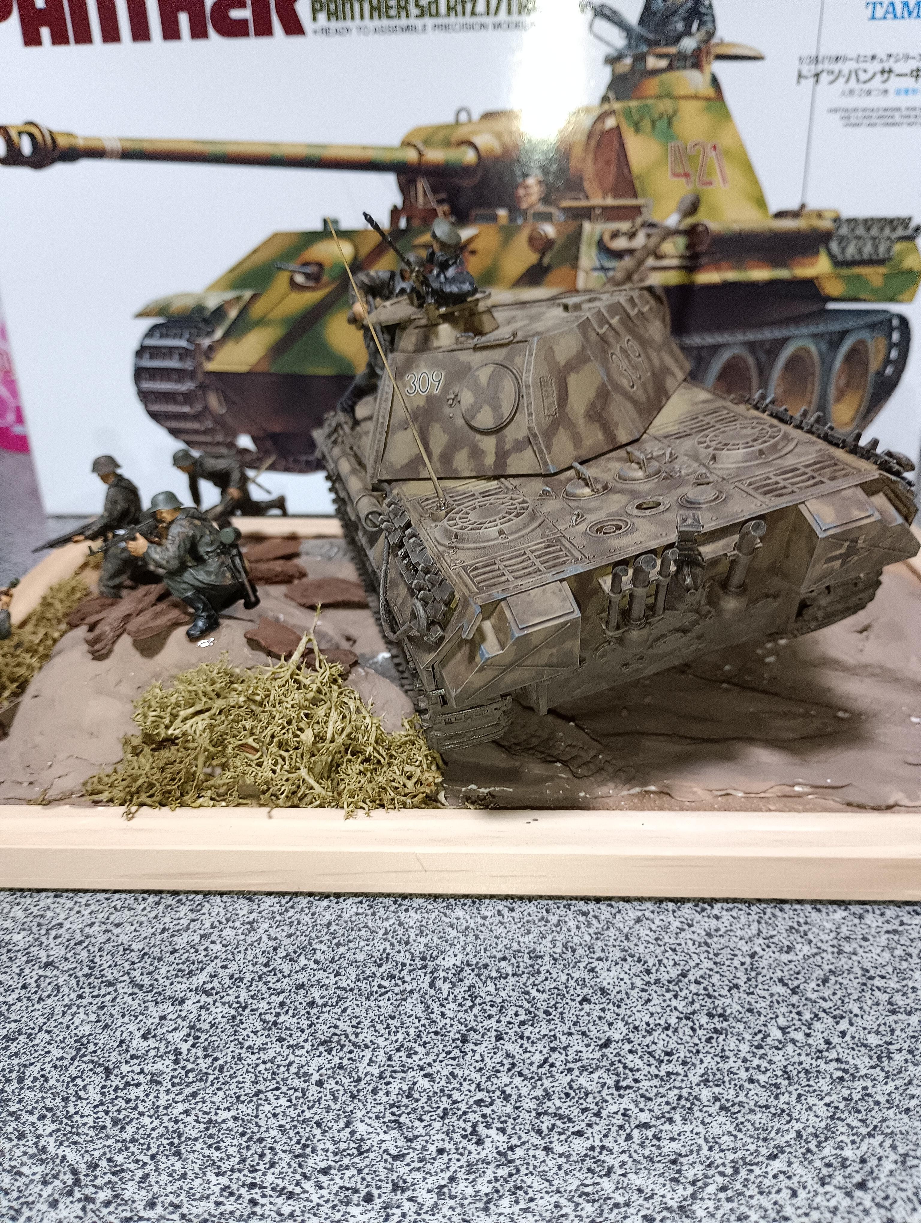 タミヤmm35/1パンターA型とドイツ兵アタックチームセットです。写真の撮り方や背景今後改めます。エアブラシなんぞ持ってませんし買う気もないので迷彩も筆塗りオンリーです。年をくってからAFVプラモを始めました。なま温かい目で見守ってやってください。