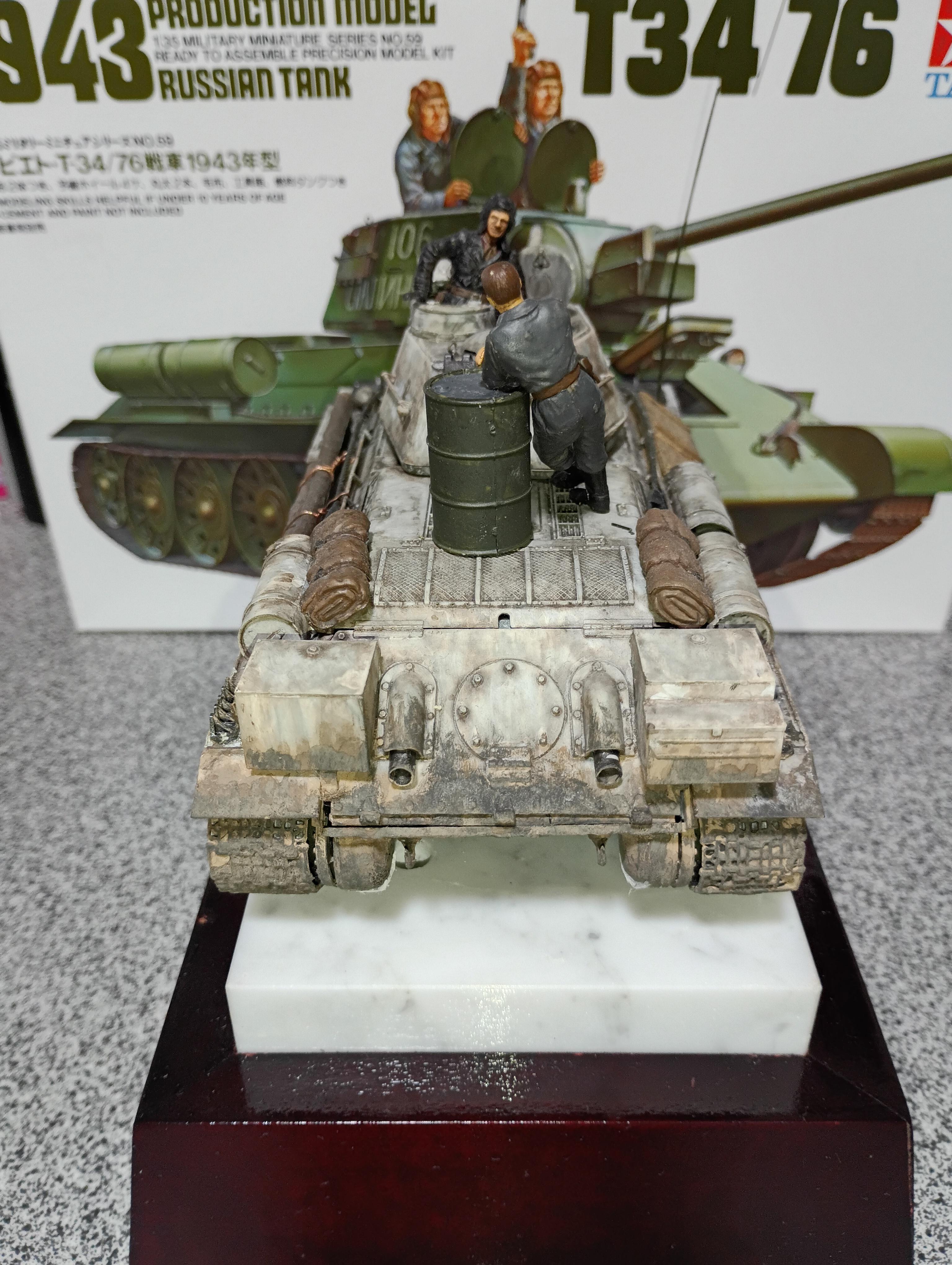 タミヤMM36/1 T34/76とソビエト戦車兵セットです。冬季迷彩やってみました。写真の撮り方や背景今後改めます。エアブラシなんぞ高級品は持ってませんし買う気もないので筆塗りオンリーです。昔の安いキットが私には最適です。年をくってからAFVプラモをはじめました。なま温かい目で見守ってやってください。