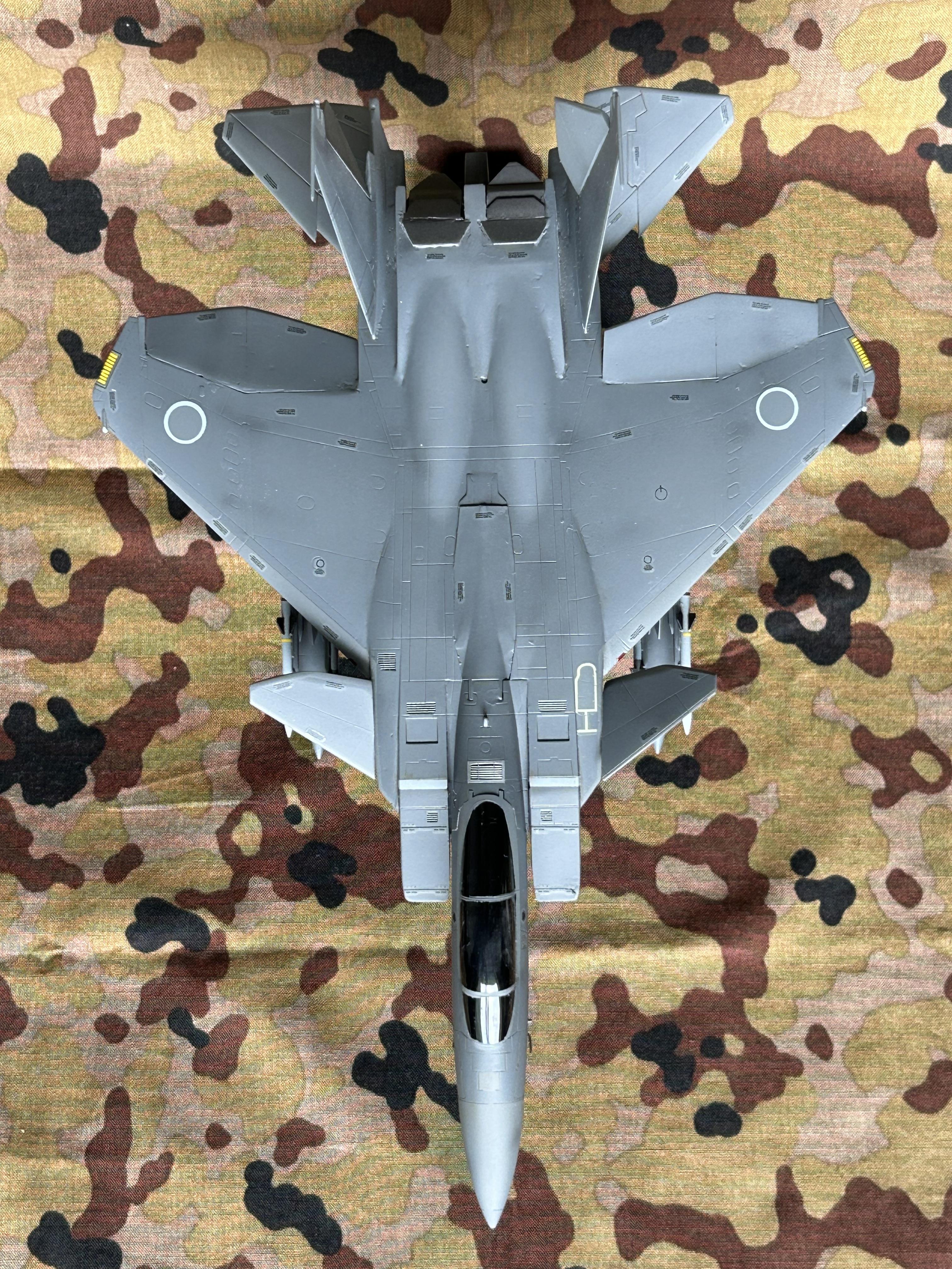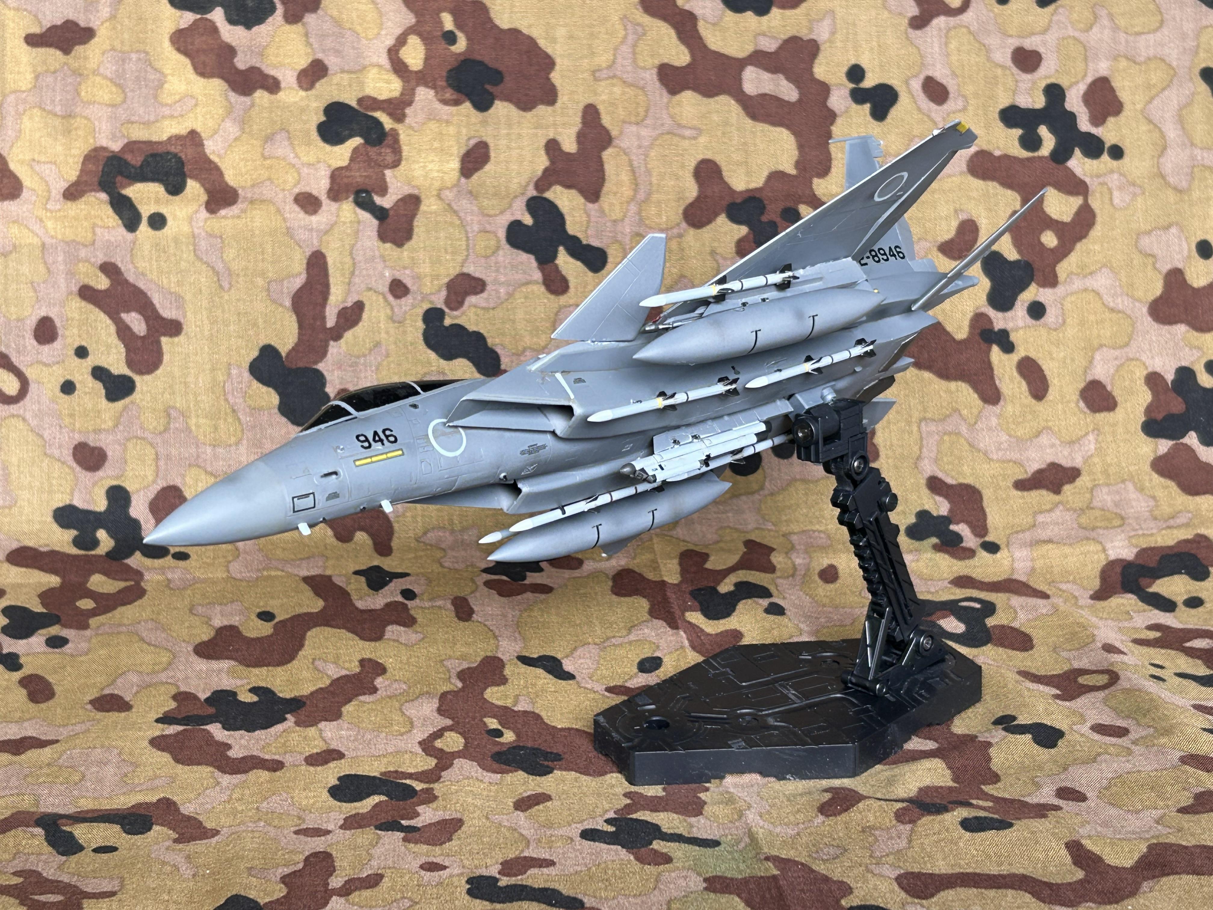 劇場版機動警察パトレイバー2に登場するイーグル・プラスを真似て作製しました。オリジナルのキットはハセガワ 1/72 Fー15Jですので、変更等されている箇所は自作、他からの流用です。カラーリングは、F-35に準じて塗り分けています。日の丸はペイントしましたが、ロービジの飛行隊マークが無いため垂直尾翼はちょっと寂しい感じです。