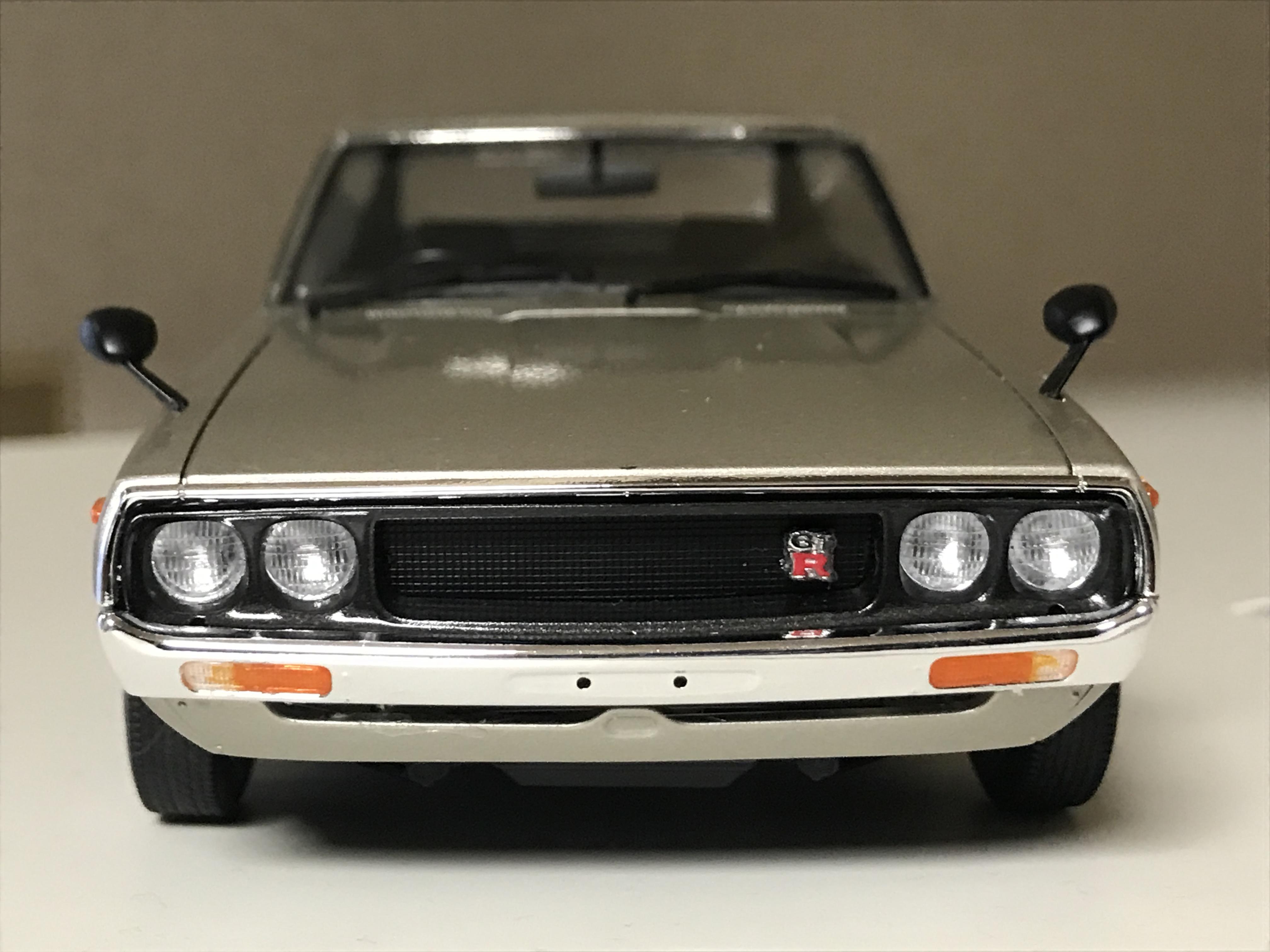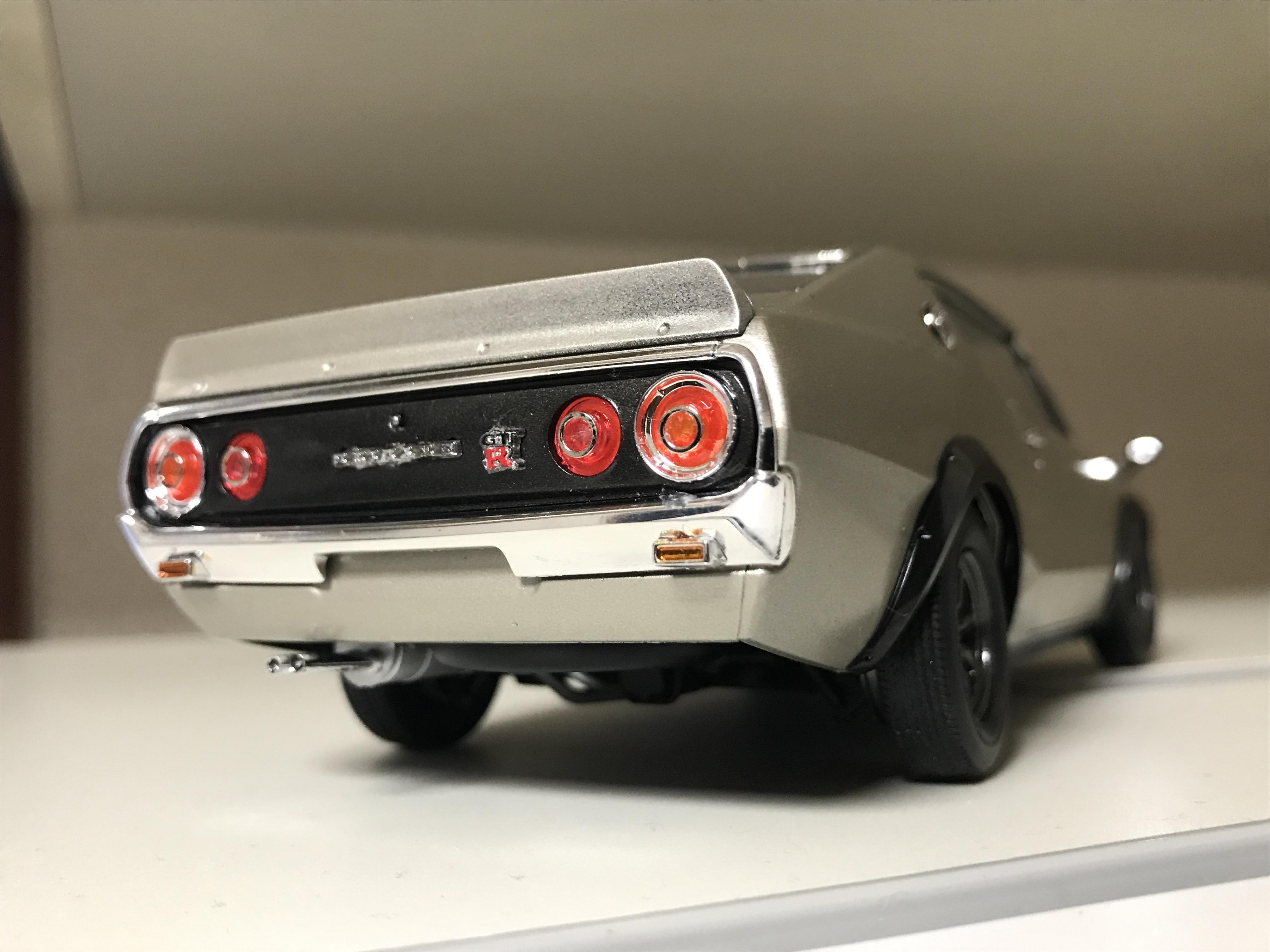 ロゴの「スカイライン」、「GT-R」の意匠は、分厚いので、デカールと迷うところです。私はメッキパーツを選び、削りましたが、いまいち。まだ分厚い感じです。あまけにボンドはみ出しの修正で、一部塗装はがしてガッカリ状態です。さらに、クリアパーツのガラス面、ノリ白が薄く、ガラス面を汚してしまい、残念な結果となりました。次からは、ガラス面は、テープで押さえたいと思います。あと、リアのコンビネーションランプの銀色のリング(インレット)、なんでこんなにしっくりこないのか。謎です。意匠は、デカールにして、仕上がりの美しさを追求をしたほうが、よかったかもしれません。ちなみに1-4-5枚目写真は、意匠なしの段階です。ともあれ、パネルラインの美しいクルマですね。
