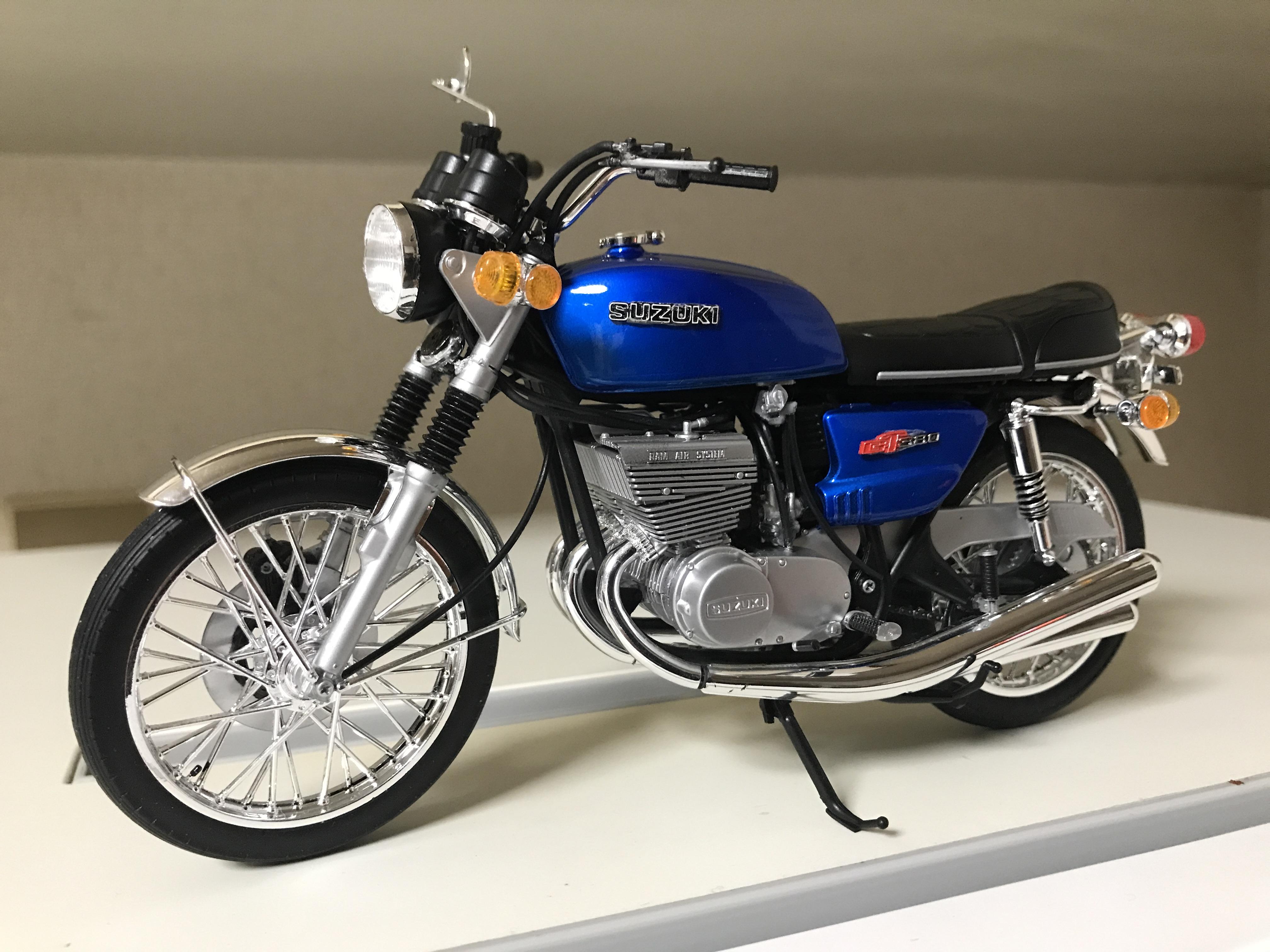 ハセガワのスズキGT380です。前掲載のオレンジをブルーに塗装し直しました。またタンクとサイドカバーの「suzuki」と「GT380」の意匠を、エンブレムとデカールで比べてみました。立体感か、清潔感か、好みの分かれるところです。デカールのシルバリング、後で直しておきます。( ´∀` )ではまた。2025-10-20 10:00:16