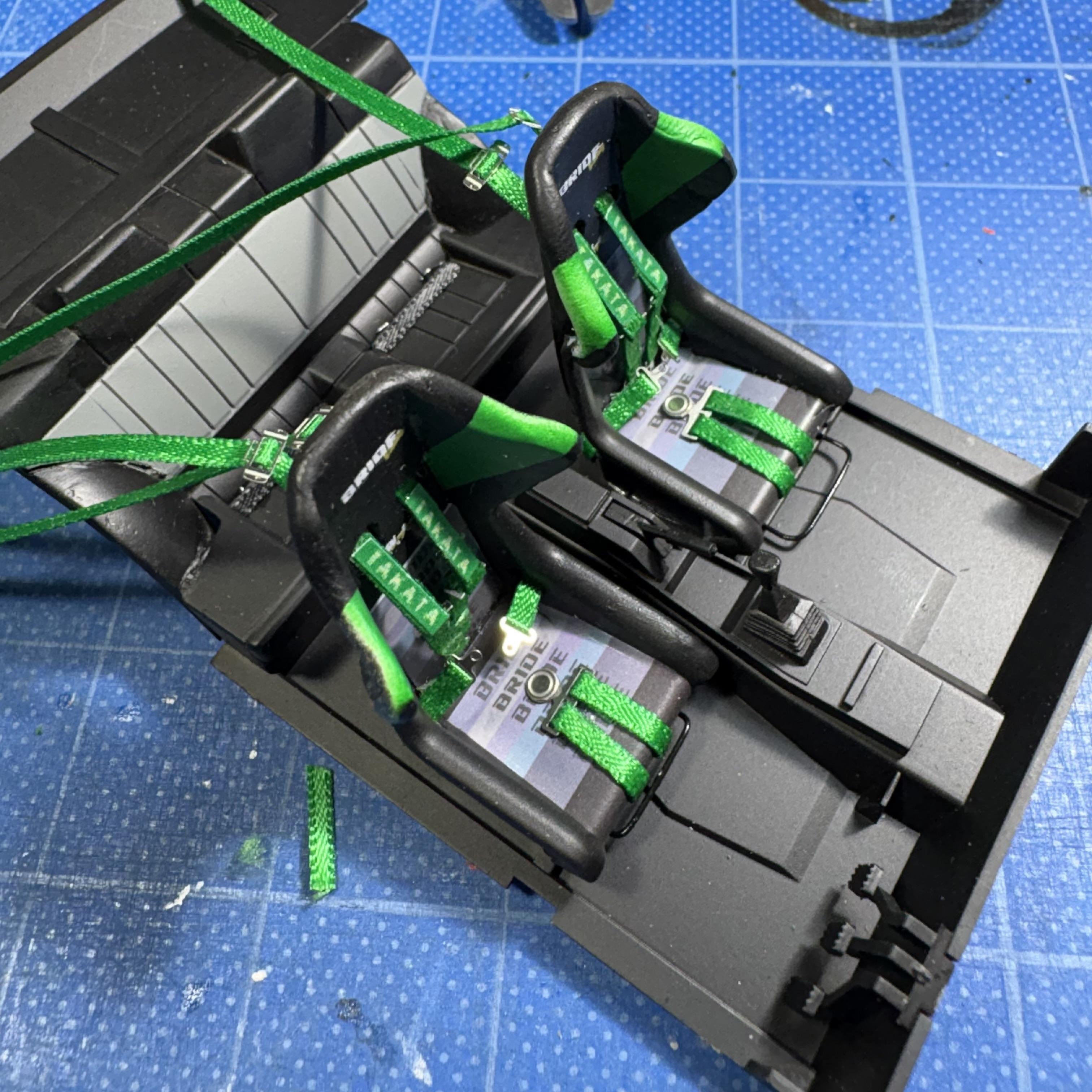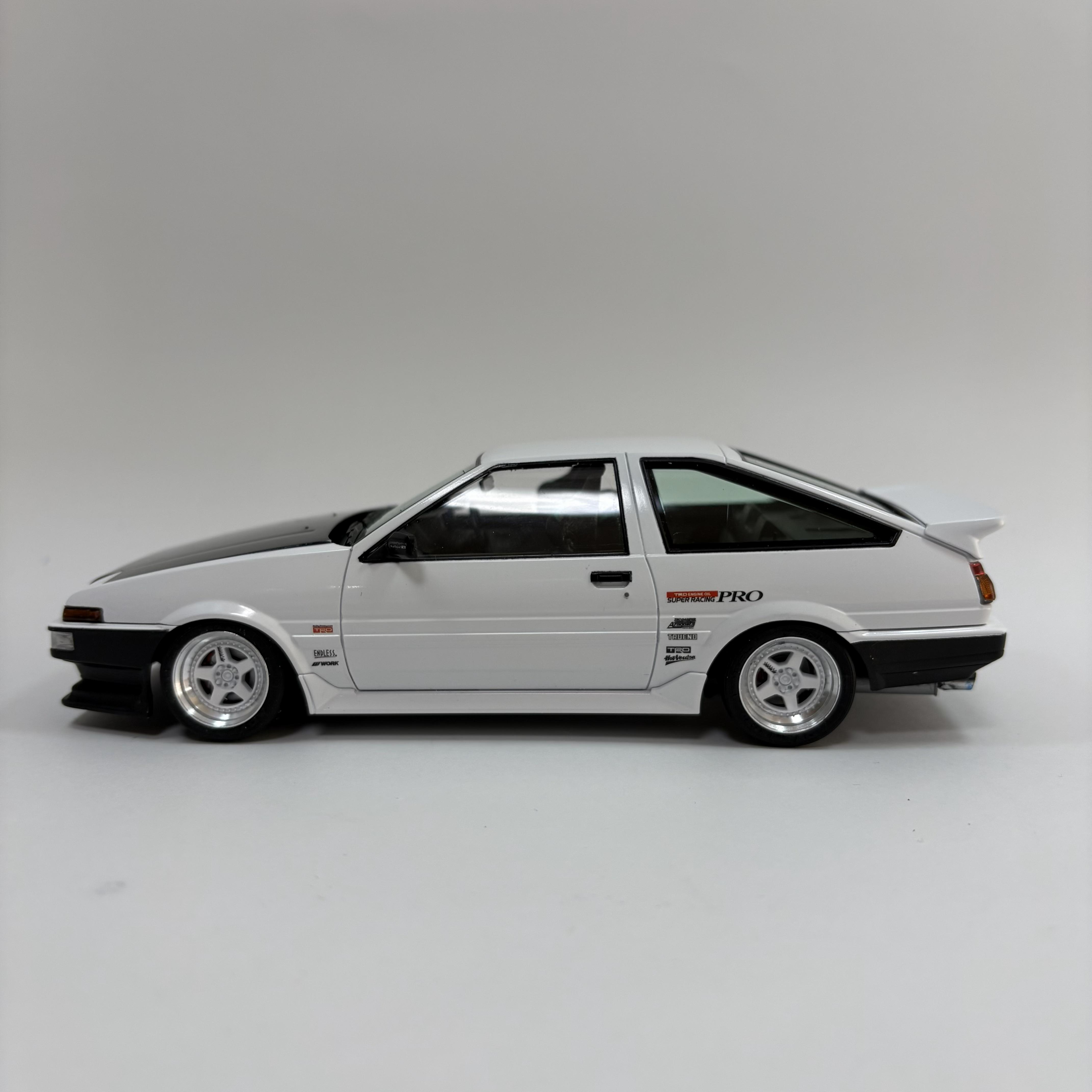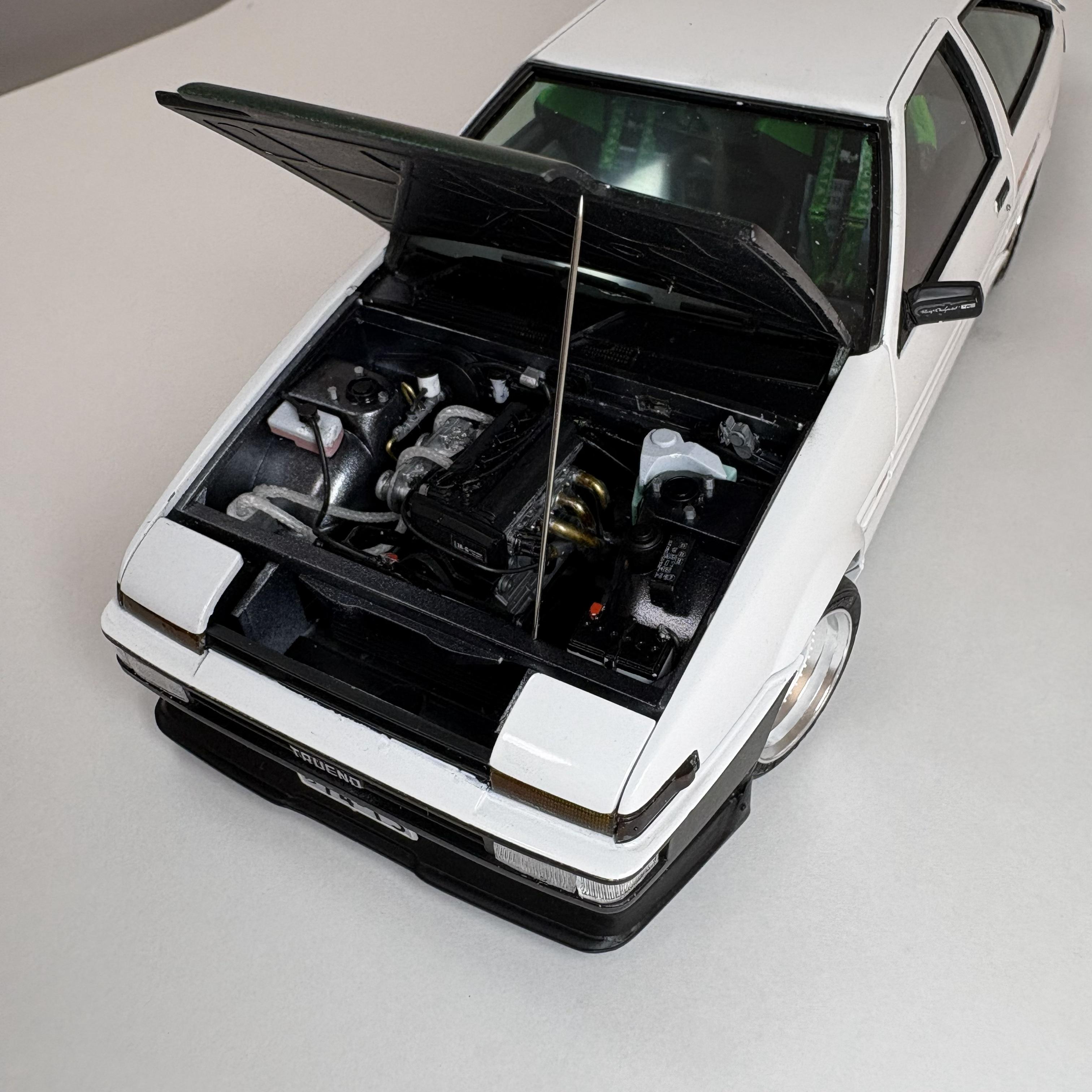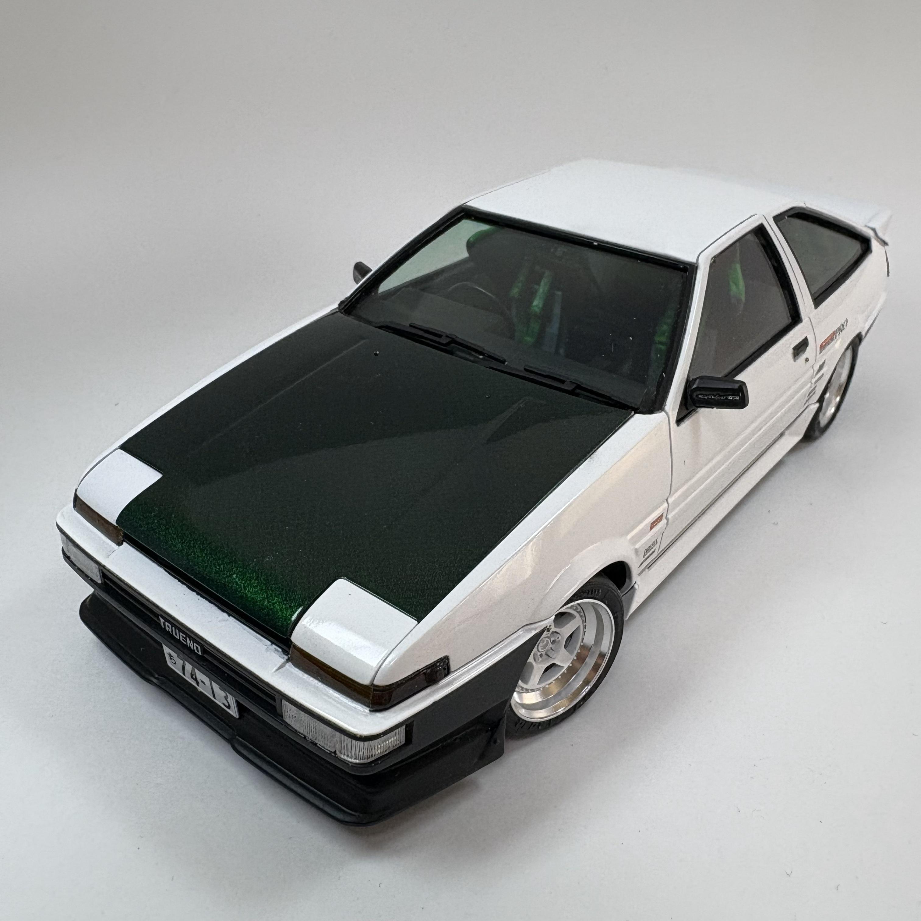 アオシマの後期トレノをベースにデカールとZoomOnのホイールを使用して土屋ストリート号を再現。ストッキングを使ったカーボン塗装もポイント。エンジンは頭文字Dの37巻仕様から流用して7A-G、AE111ヘッドとした。シートは加工してBRIDEの土屋バージョンにし、土屋氏のイメージカラーのグリーンからエッチングパーツとサテンリボンでTAKATAの6点式にしてみた。
