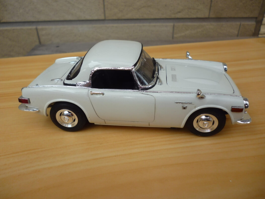 フジミからリニューアル販売される前、日東が初めて販売したホンダS800の最終モデルM型です。前後の側面に大型のウインカーが付いているのが特徴で、フジミやタミヤのモデルよりやや不格好?かも。細かいところは手直ししてますが、ほぼ素組です。発売当時はS500・S600・S800初代を再現するために大改造が必要でしたが、今は外観だけならフジミのモデルで簡単に作り分け出来るのが有難いです。ちなみに全くそのままの状態で童友社から再販されてましたが、店頭には無いかも。