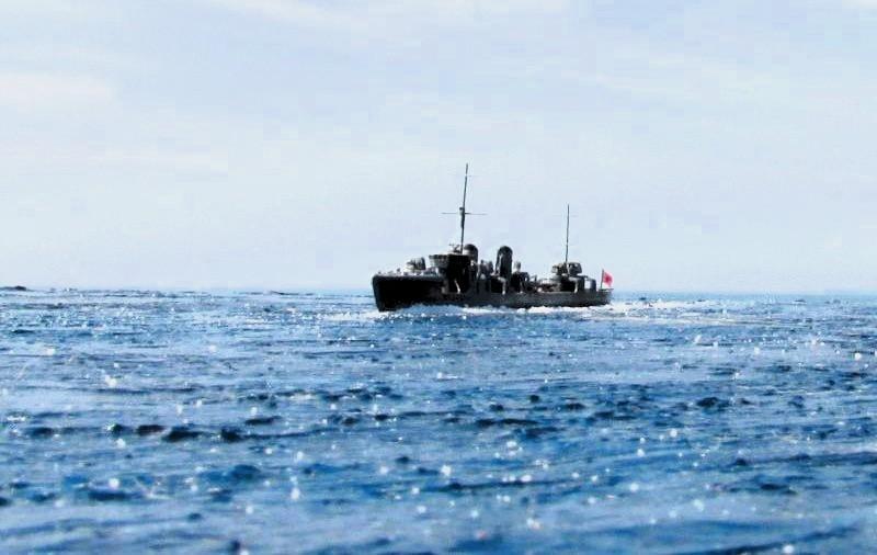 1/700ピットロードほぼ素組でマストの空中線を伸ばしランナーで張ったぐらいです。海は青色セロファン、塩で白波を表現しています。撮影は野外での一発撮りの特撮。2020-10-09 22:11:50